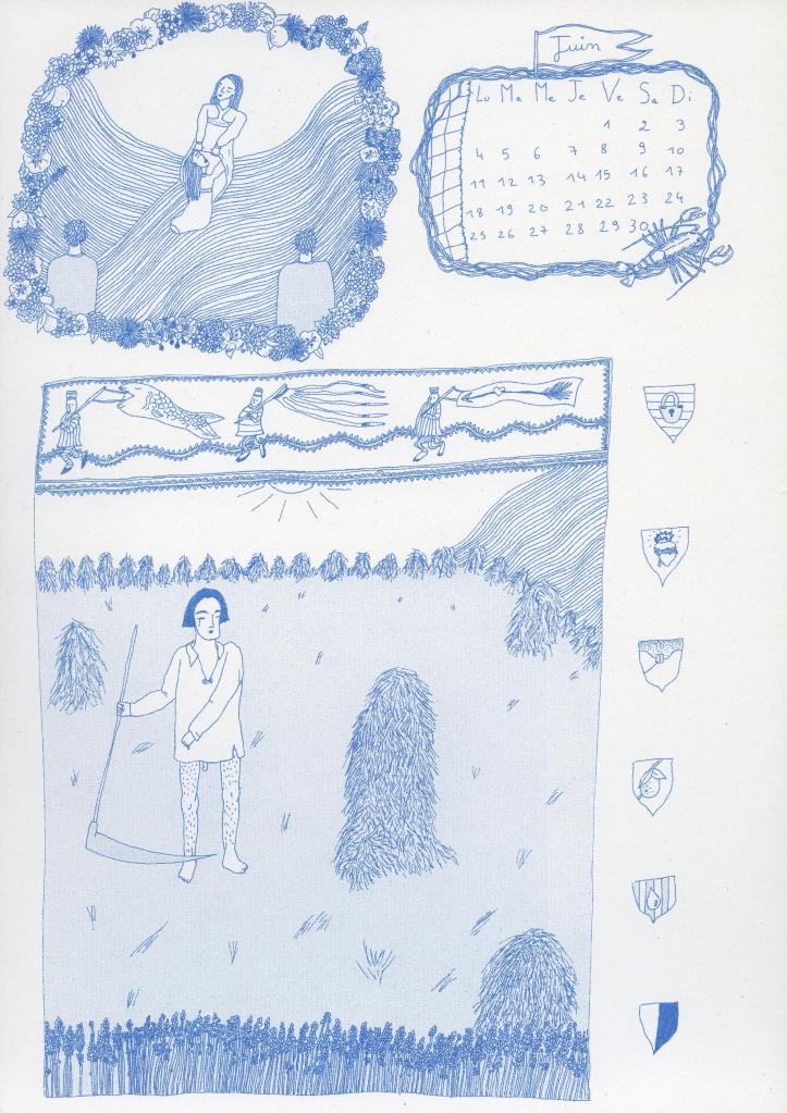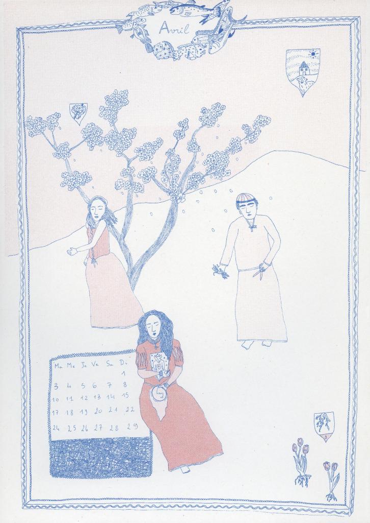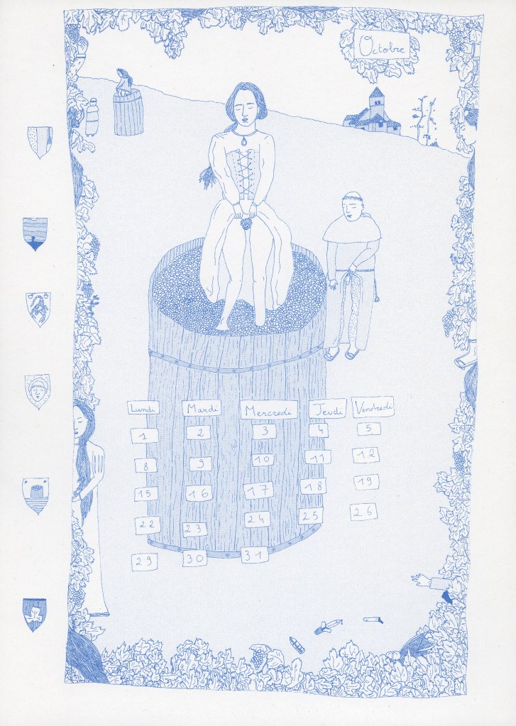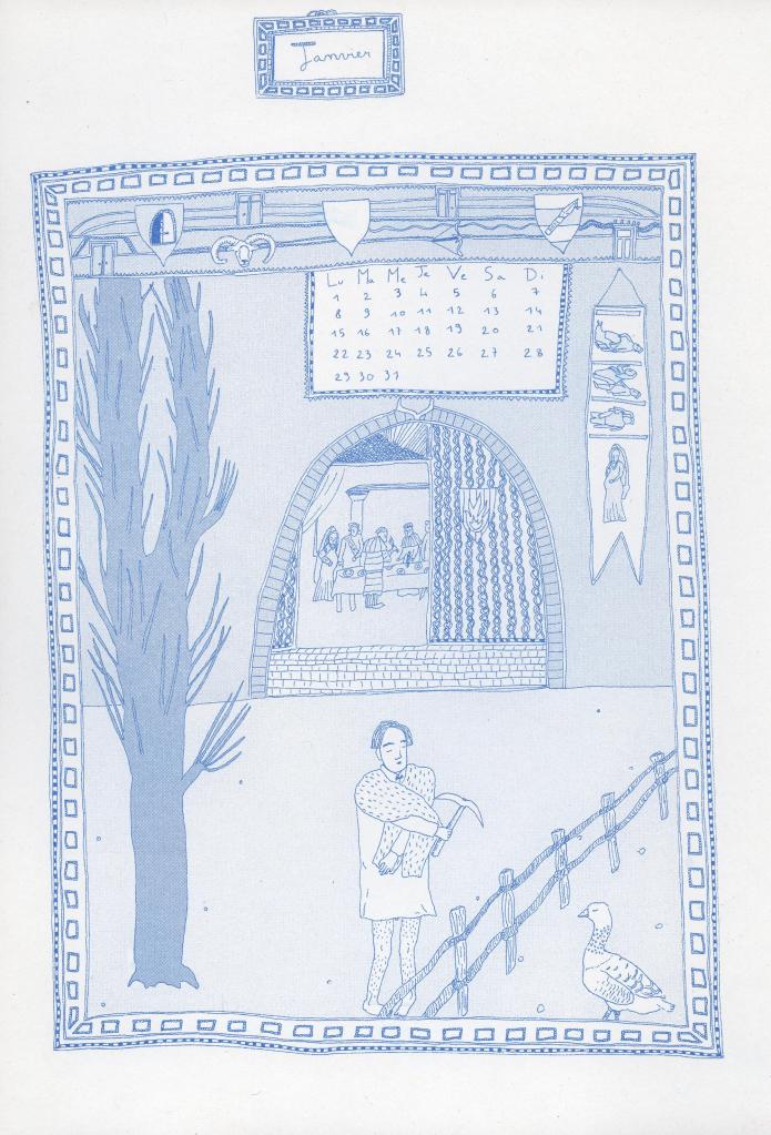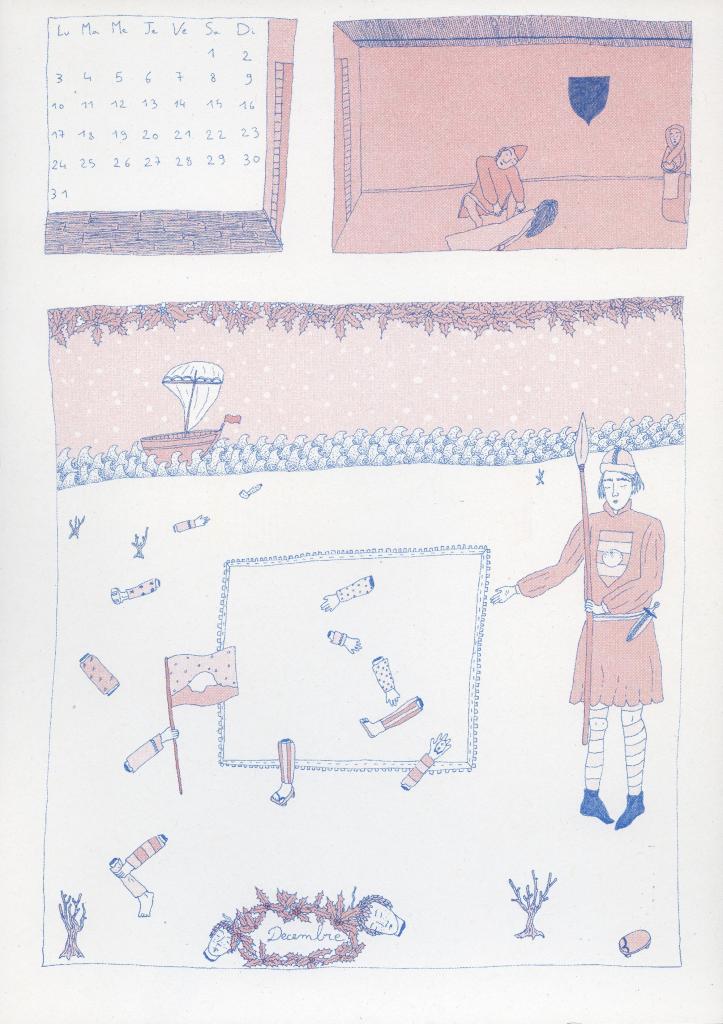 Prendre conscience de son corps à travers des rituels strictement définis par soi-même, cadre réconfortant. L’artiste nous livre alors un mode d’emploi spécifique ainsi que des dessins illustrant la notion de soin à travers des éléments nous appartenant réellement, et nous les appropriant, formant un chemin parallèle à la médecine moderne qui évite les particularités de chacun, se conformant à la norme suprême d’une esthétique unique et artificielle. Les œuvres de Sarah Korzec manient avec humour et subtilité les notions de contes, de croyances d’un côté, et de rationalité et de sciences de l’autre, les mettant au même plan pour questionner notre rapport aux autres, à la vérité et à la réalité. Les douze planches, sous la forme d’un calendrier rappelant les almanachs médiévaux du Calendrier du bougre et autres mois lubriques, constituent une remise au centre de la réflexion du temps qui s’écoule, rythmé par des récits qui structurent le réel. Chaque mois est une illustration, mêlant les mythes et légendes de civilisations diverses.