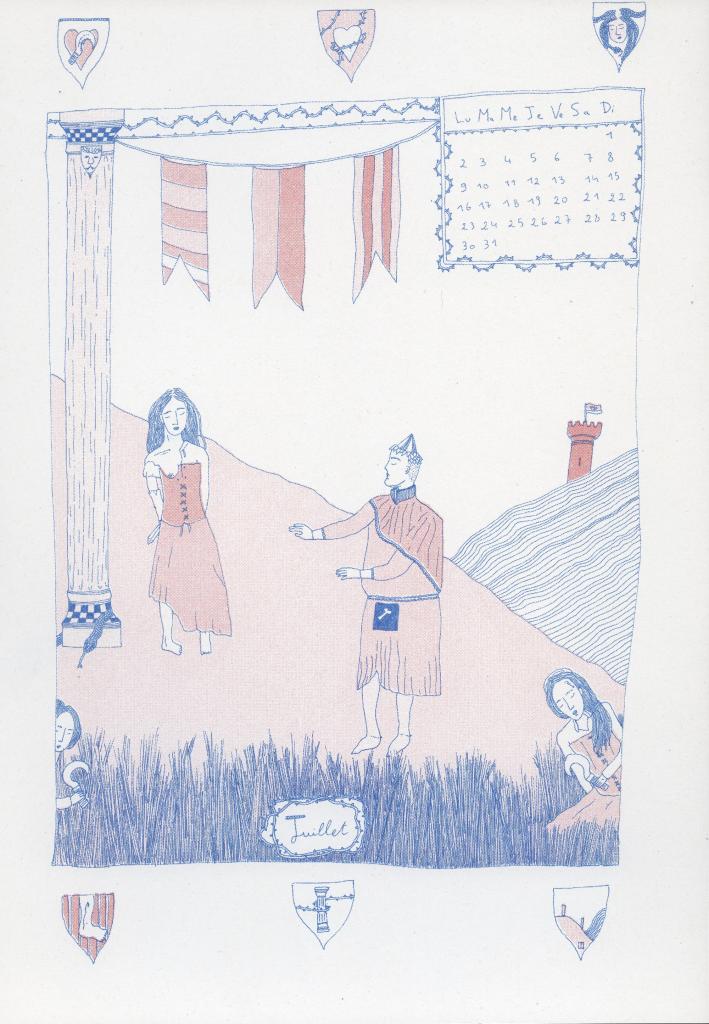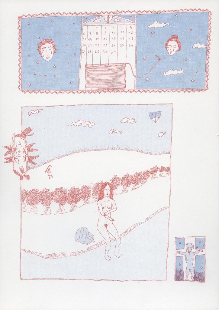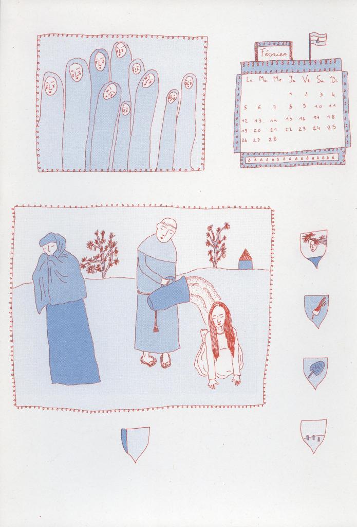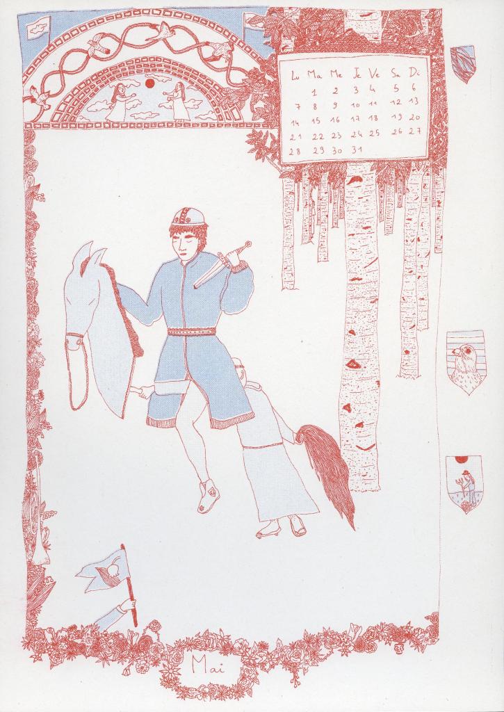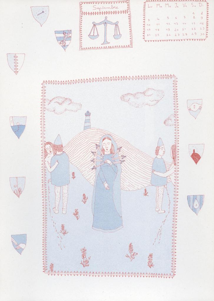 Prendre conscience de son corps à travers des rituels strictement définis par soi-même, cadre réconfortant. L’artiste nous livre alors un mode d’emploi spécifique ainsi que des dessins illustrant la notion de soin à travers des éléments nous appartenant réellement, et nous les appropriant, formant un chemin parallèle à la médecine moderne qui évite les particularités de chacun, se conformant à la norme suprême d’une esthétique unique et artificielle. Les œuvres de Sarah Korzec manient avec humour et subtilité les notions de contes, de croyances d’un côté, et de rationalité et de sciences de l’autre, les mettant au même plan pour questionner notre rapport aux autres, à la vérité et à la réalité. Les douze planches, sous la forme d’un calendrier rappelant les almanachs médiévaux du Calendrier du bougre et autres mois lubriques, constituent une remise au centre de la réflexion du temps qui s’écoule, rythmé par des récits qui structurent le réel. Chaque mois est une illustration, mêlant les mythes et légendes de civilisations diverses.