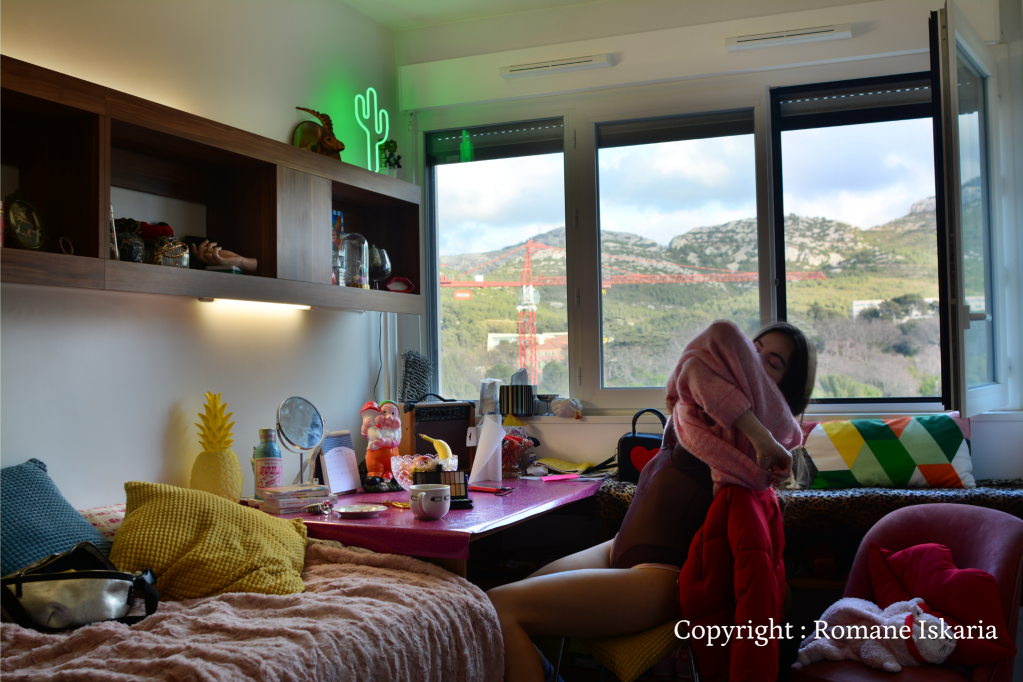 Je suis entrée à l’École Nationale Supérieure d’Architecture de Marseille en septembre 2015. C’est à ce moment-même que j’ai quitté la maison de mes parents pour une somptueuse chambre de 9,9m². Quelle ne fut pas ma surprise quand j’ai découvert que la totalité du mobilier – à savoir un jeu d’étagères murales fixé le long du mur ainsi que la porte d’entrée – était d’une seule couleur : RGB 245, 103, 107, ce qui se rapproche d’un Pantone 178c. En d’autres termes, cette couleur était directement inspirée d’un pavé de saumon supérieur que vous dégusteriez dans votre meilleur Resto U. Néanmoins, dans mon malheur chromatique, je me permettais de relativiser au regard de ceux qui logeaient dans une chambre orange délavé ou pire, dans une chambre ocre délavé. Moi qui ai pour habitude (voire névrose) de préférer les pigments aseptisés et collectionne des objets blancs, noirs ou dérivés j’ai, avec le temps, appris à déceler et apprécier, parfois, ce que la lumière offre au bois compressé recouvert d’une chose rose collée dessus. J’estime avoir eu de la chance quant à l’emplacement du bâtiment que j’habitais.