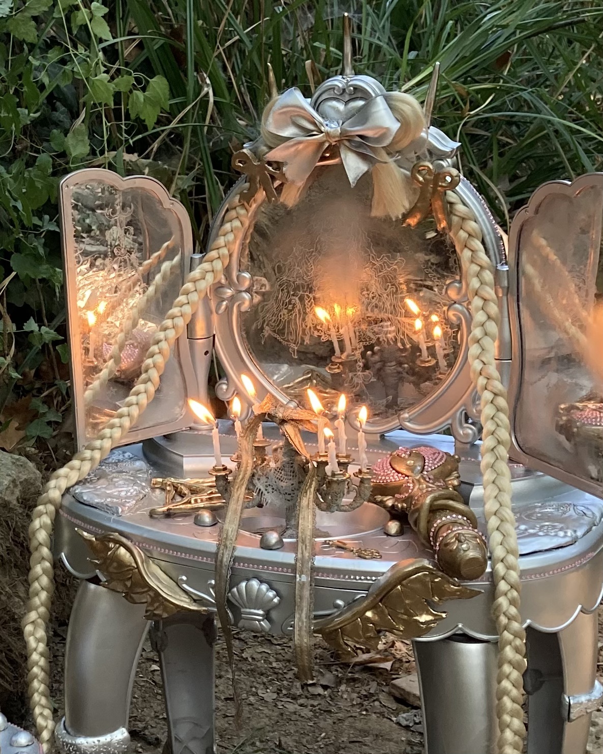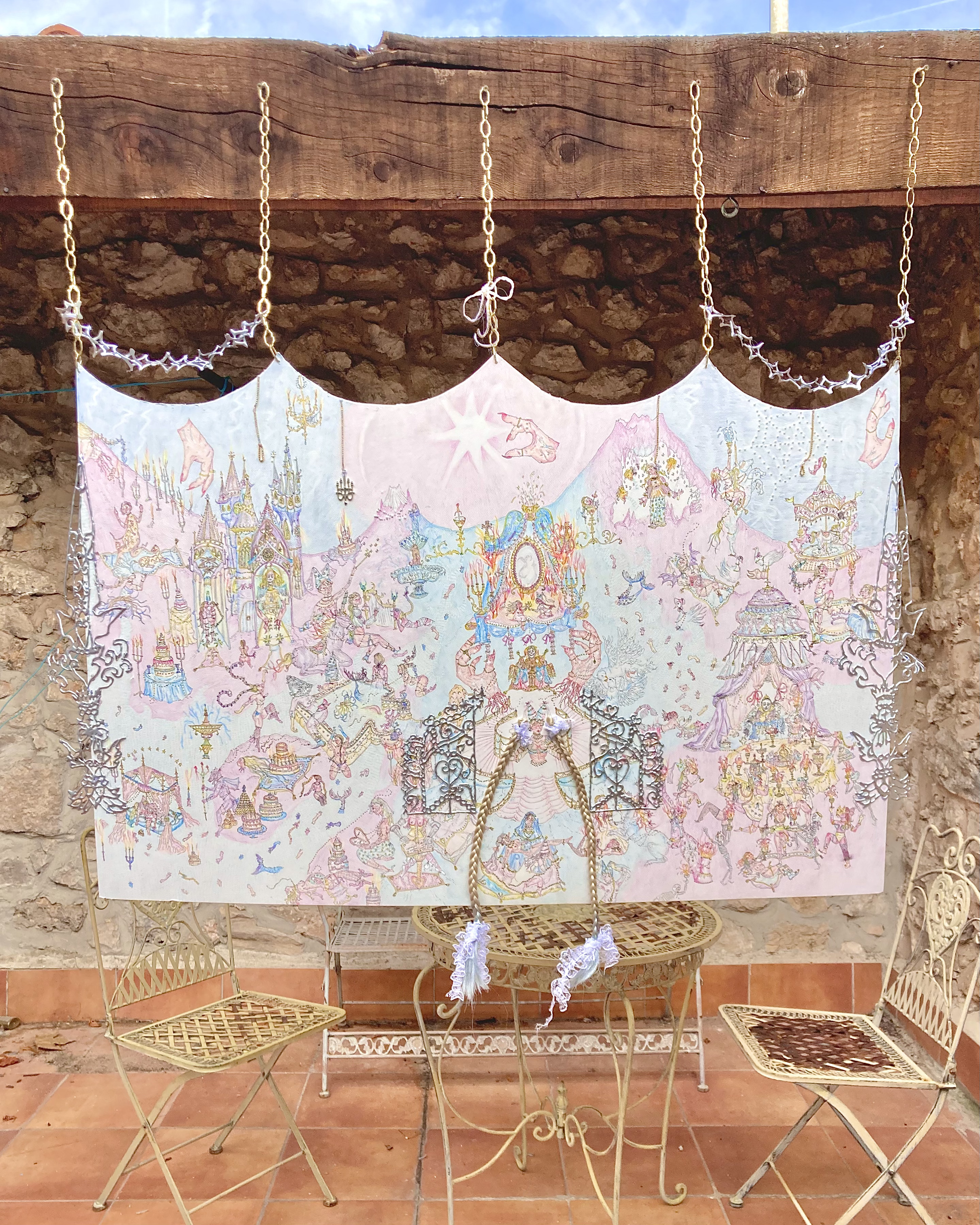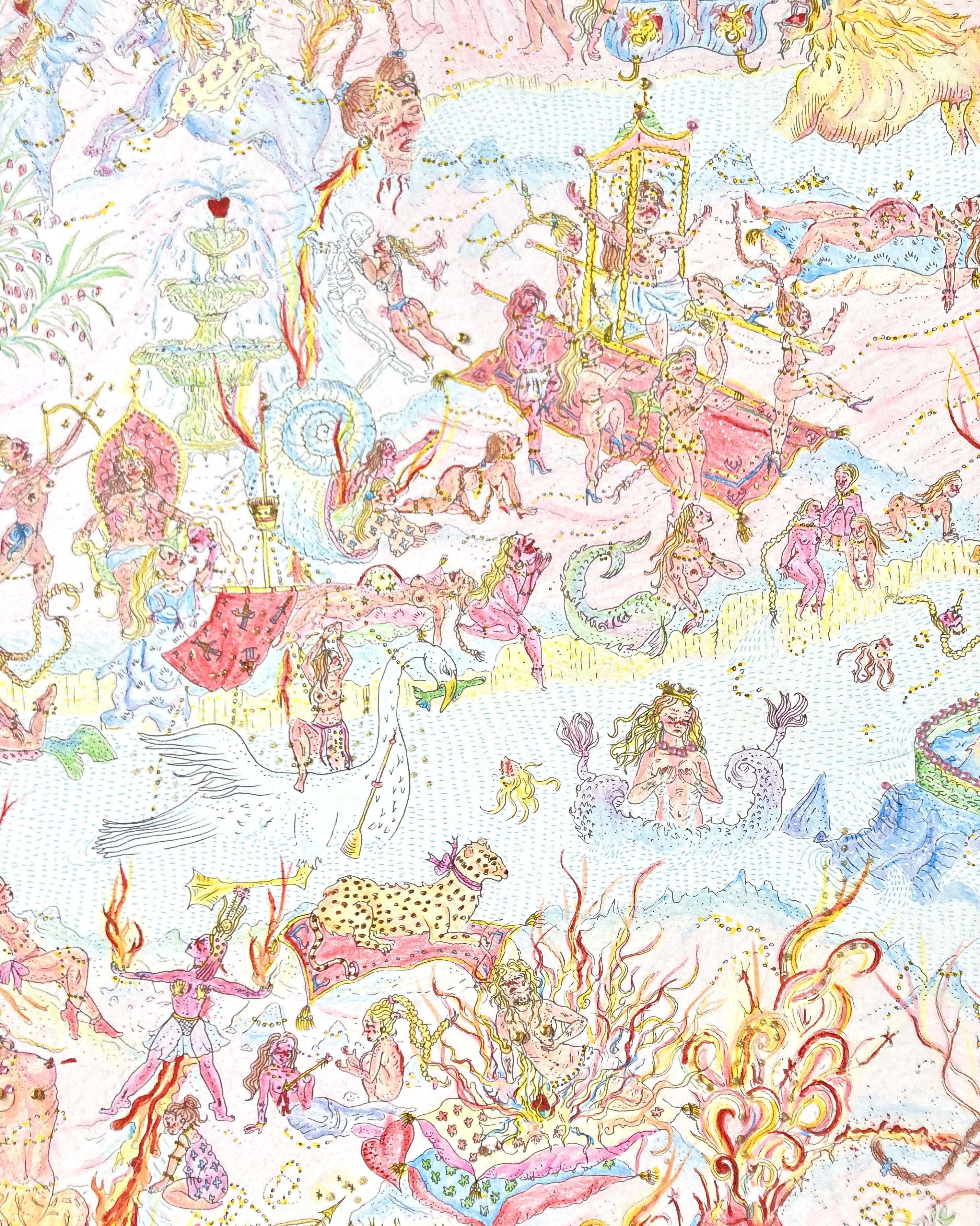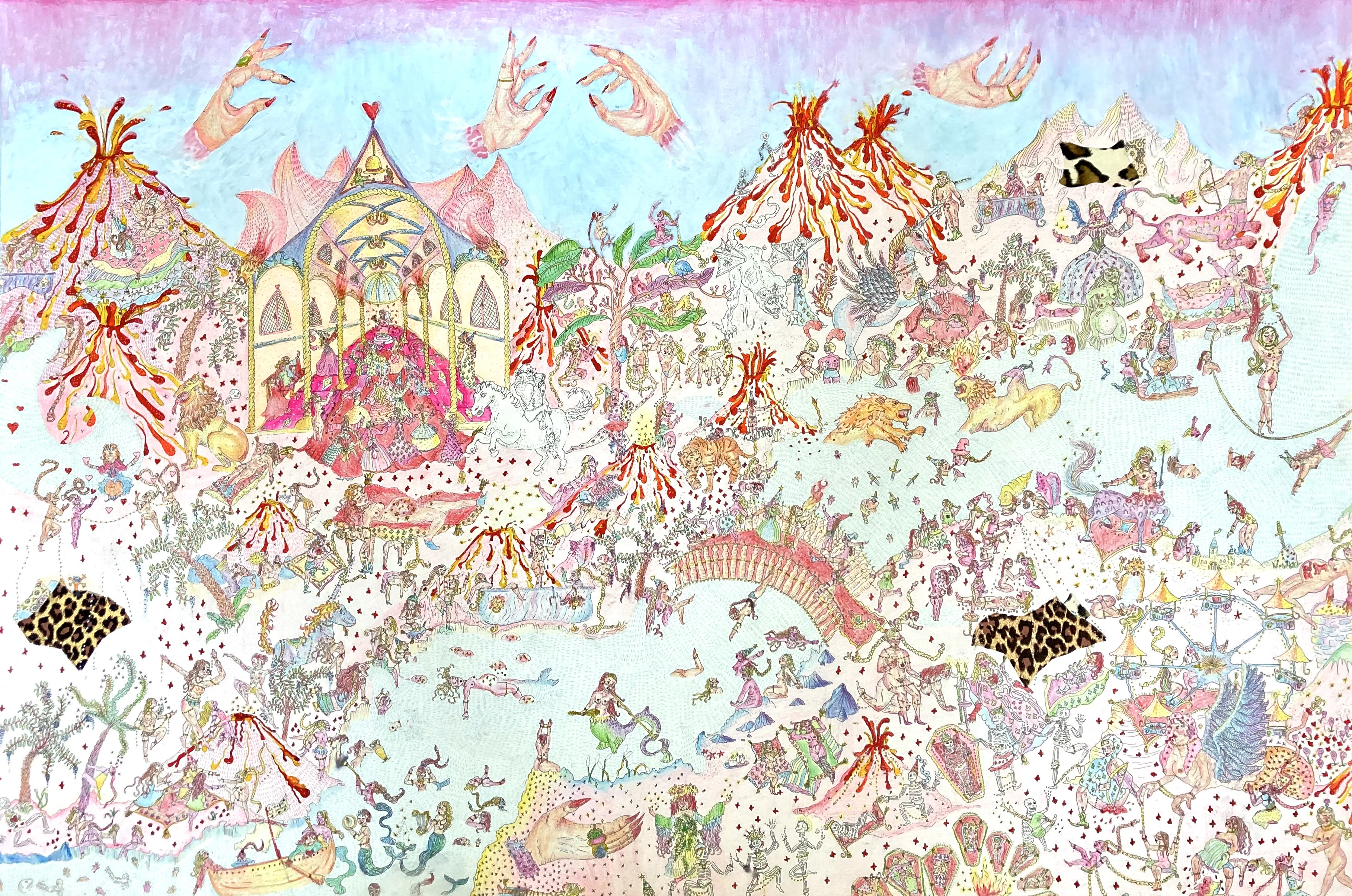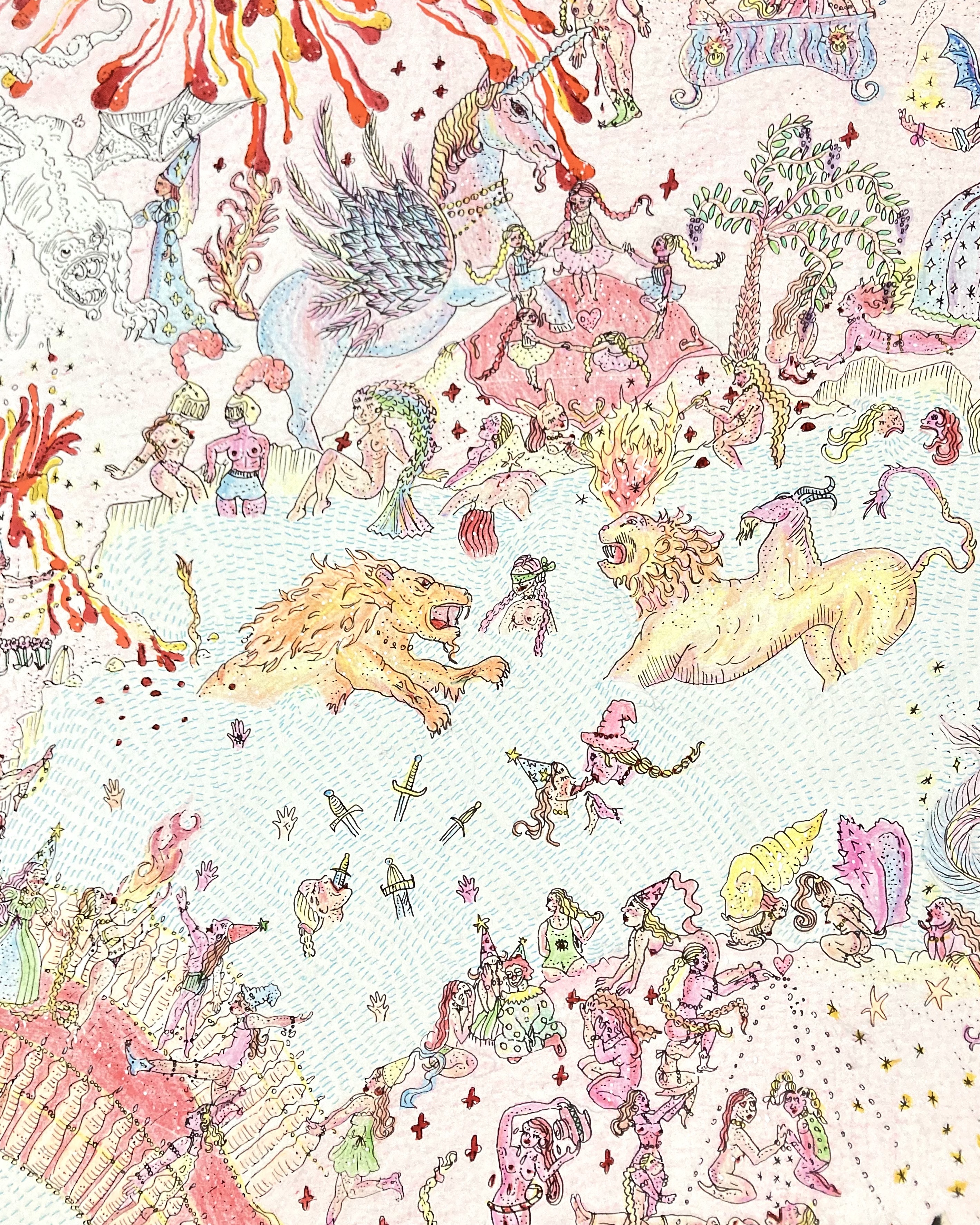 L’imaginaire magique déployé télescope thèmes et obsessions : le pavillon de tournoi voisine la princesse, qui observe la licorne, qui renvoie, enfin, par sa nature de créature soignante, aux crocs empoisonnées des manticores. Chaque élément, s’il se suffit à lui-même, est le ciment d’un monde en soit propre à chaque composition. Ces épisodes de vies de saint·es profanes s’articulent comme des scènes de dévotion, en témoignent par exemple ces mains coupées et volantes, ex-voto sanglants surplombant des apocalypses joyeuses, entre danses macabres de squelettes, éruptions volcaniques et combats de lions, soulignant une dynamique frénétique et ludique. Ces univers autonomes sont des hommages multiples, à l’histoire, aux formes, à l’imaginaire qui les transforment et les mythifient.