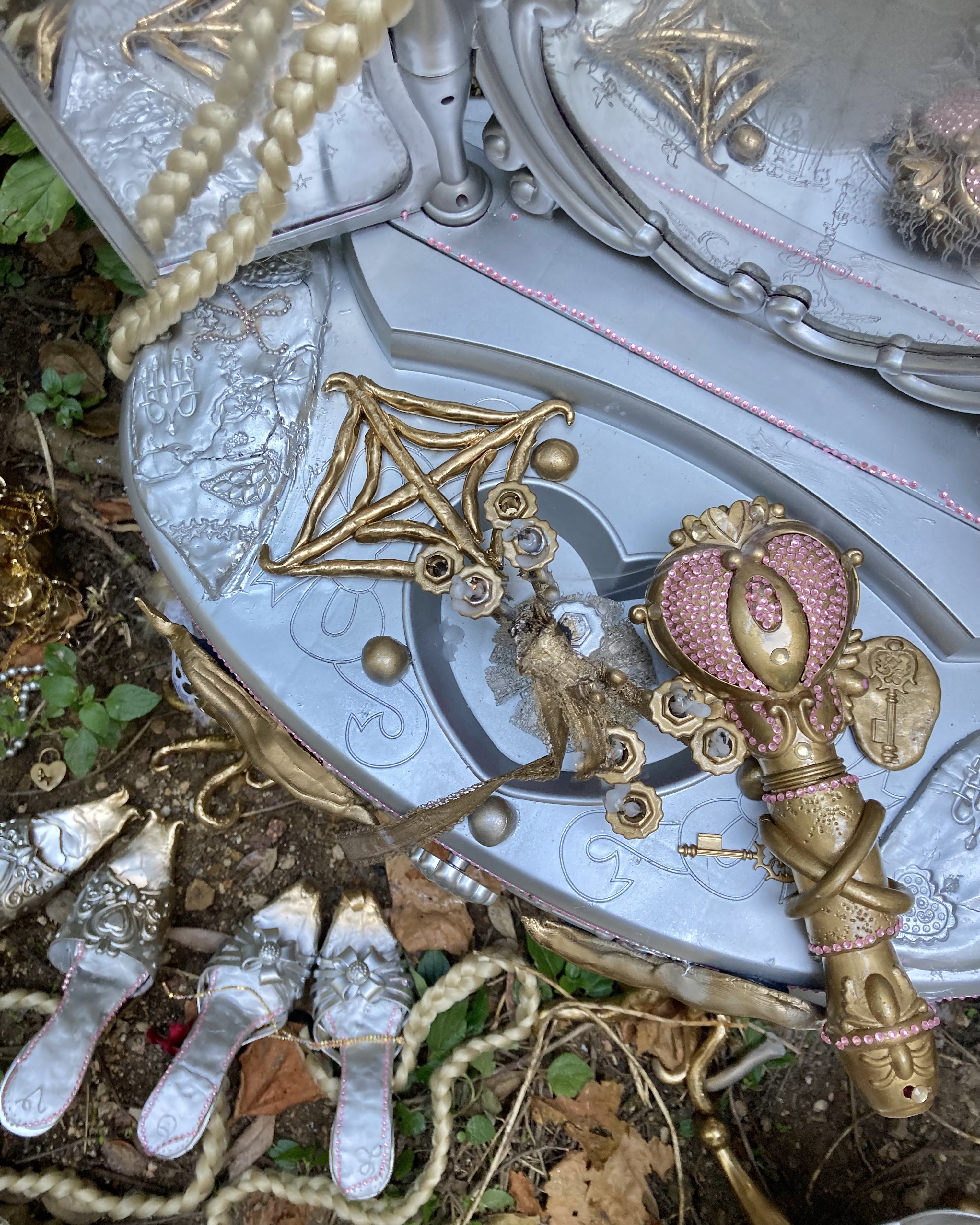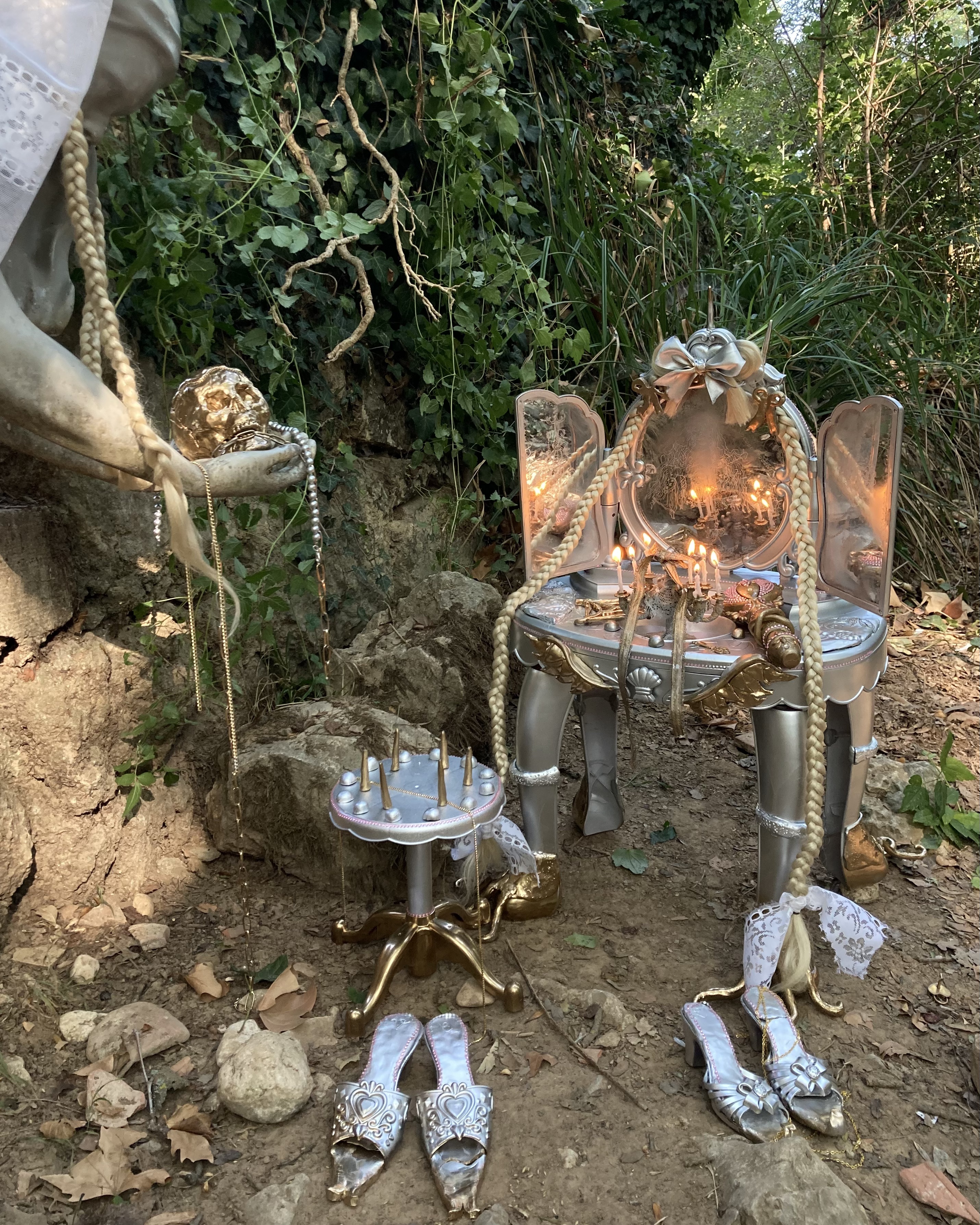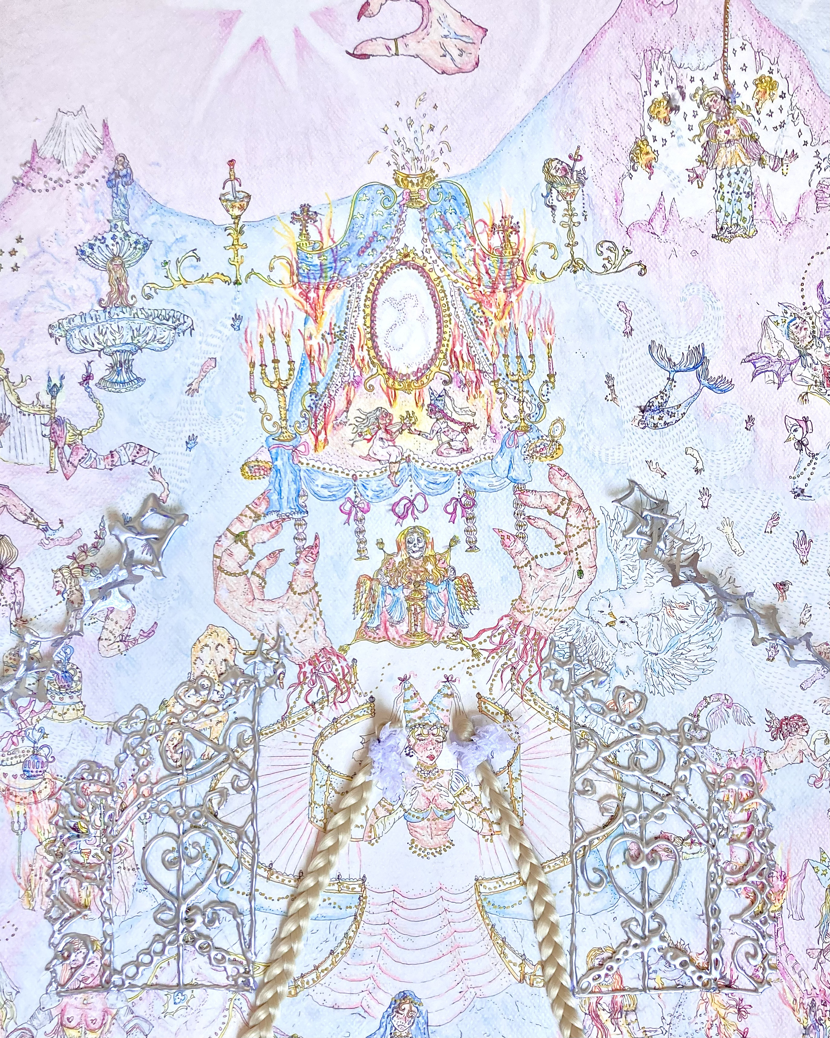 L’univers syncrétique de Julia n’est troublé que par la présence de mains-démiurges : celles qui créent et façonnent un monde, partant de la matière existante. Sensibles par excellence, ces organes préhensibles sont autant des deus ex machina que les mains de l’artiste. Elles peuvent expliquer le point de vue omniscient, dans des œuvres dévoilant églises en coupe et scènes intimes, nudités apaisées et puissant érotisme, sans voyeurisme. Elles nous lient à la position de l’artiste, à son regard. La scopophilie5 est évacuée : le plaisir de posséder autrui, la pulsion sexuelle freudienne qui vise à soumettre l’autre à son regard contrôlant. Si les personnages présentés semblent s’être construits sous un œil masculin, en objets de son désir, ils s’en affirment libérés. L’intérêt de Julia pour le gynécée relève de cette même liberté, permise et donnée dans cette partie de maison grecque et romaine réservée aux femmes à l’Antiquité. En dessin comme en volume, Julia collecte les détails et fantasme cette contrainte genrée, mêle jouets, attributs et symboles en des rencontres improbables, célébrées et accompagnées par moultes dentelles, strass bons marchés, chaînes bling et toisons léopards.